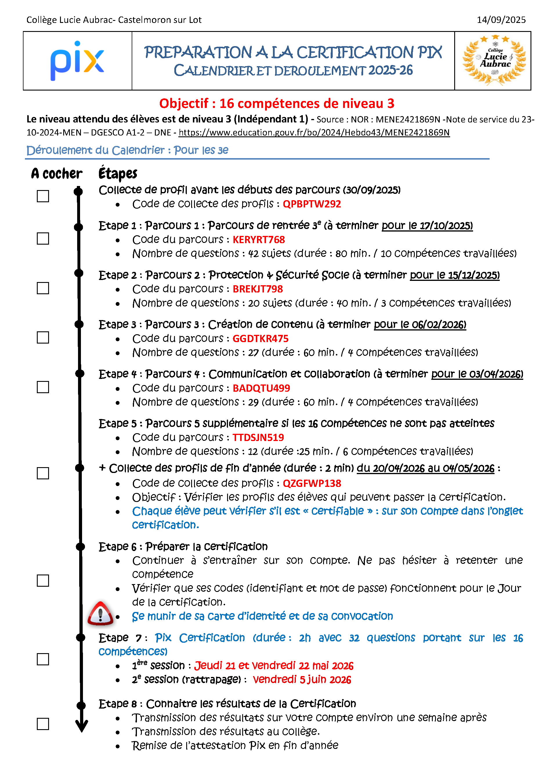 L'arrêté du 30 août 2019 précise que les compétences numériques acquises font l’objet d’une certification nationale délivrée par le service public en ligne Pix.